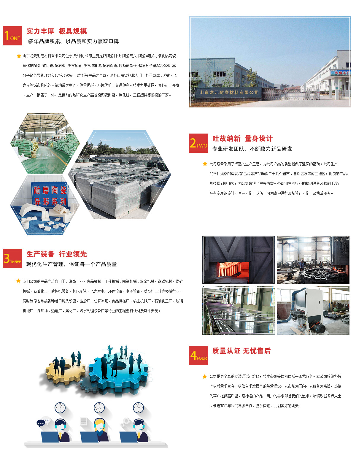 山東龍?jiān)湍ゲ牧嫌邢薰疚挥诘轮菔校局饕且?a href="/">鑄石板、氧化鋁陶瓷、三合一陶瓷復(fù)合襯板、陶瓷復(fù)合板、碳化硅、壓延微晶板、鑄石沖渣溝、氧化鋁陶瓷管道、氧化鋁陶瓷彎頭、三合一復(fù)合陶瓷板、鑄石管道、鑄石彎頭、氧化鋁陶瓷片、超高分子量聚乙烯板、三合一復(fù)合陶瓷板等產(chǎn)品為主營(yíng),地處山東省的北大門,處于京津、濟(jì)南、石家莊等城市構(gòu)成的三角地帶之中心,位置優(yōu)越、環(huán)境優(yōu)雅、交通便利。技術(shù)力量雄厚,集科研、開發(fā)、生產(chǎn)、銷售于一體,是目前內(nèi)地研究生產(chǎn)高性能陶瓷耐磨,碳化硅,工程塑料等規(guī)模大的廠家之一。公司設(shè)備采用了成熟的生產(chǎn)工藝,為公司產(chǎn)品的質(zhì)量提供了堅(jiān)實(shí)的基礎(chǔ)。